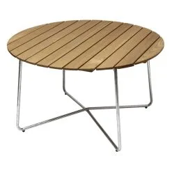 Grythyttan Stålmöbler’s table 9A is an attractive and hardwearing outdoor table that pairs a steel base with a round teak wood top. Designed by Artur Lindqvist in the 1930s, this table is ideal for approximately 4 people, and its detachable base allows it to be stored and transported in as narrow a space as possible. Over time, the galvanized steel parts will acquire a matte surface, while oak parts will maintain their warm colour when oiled regularly.